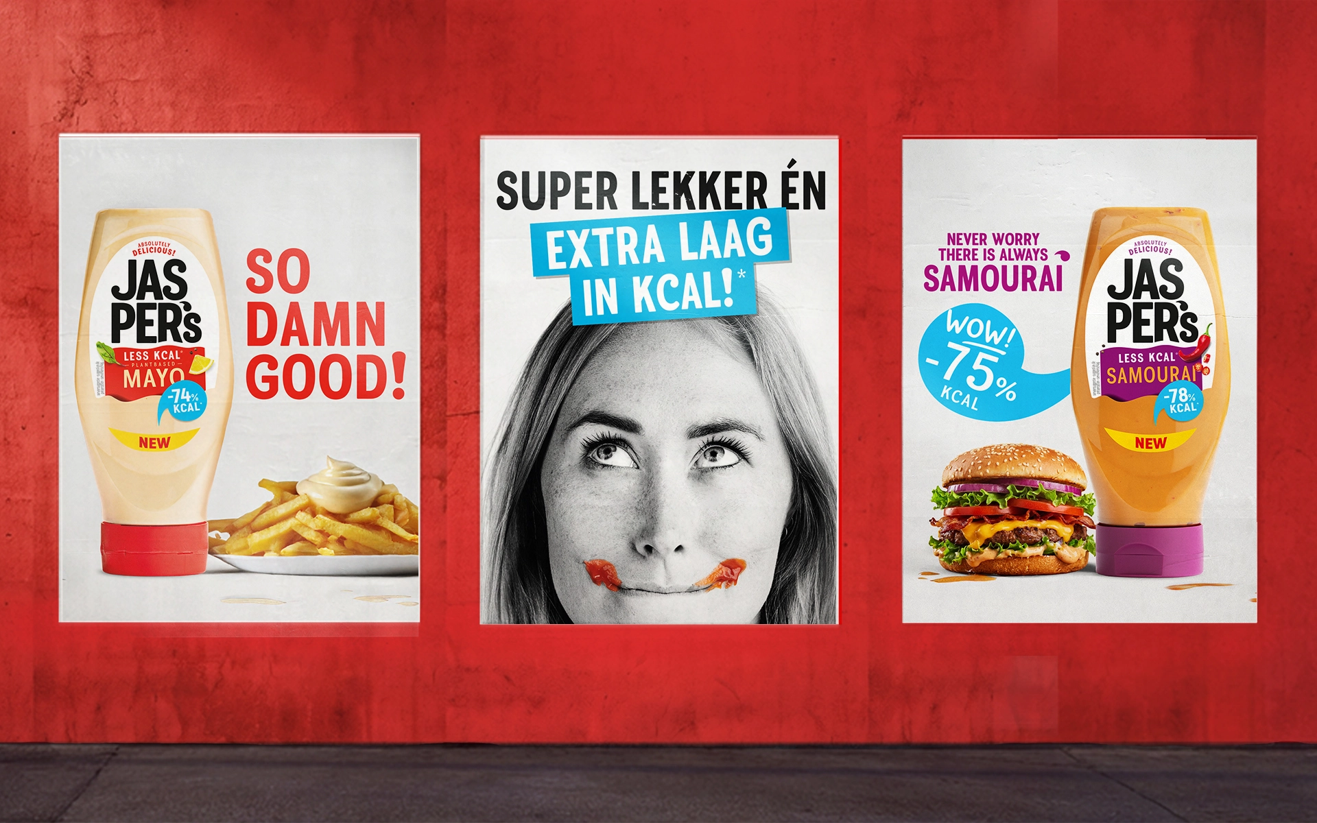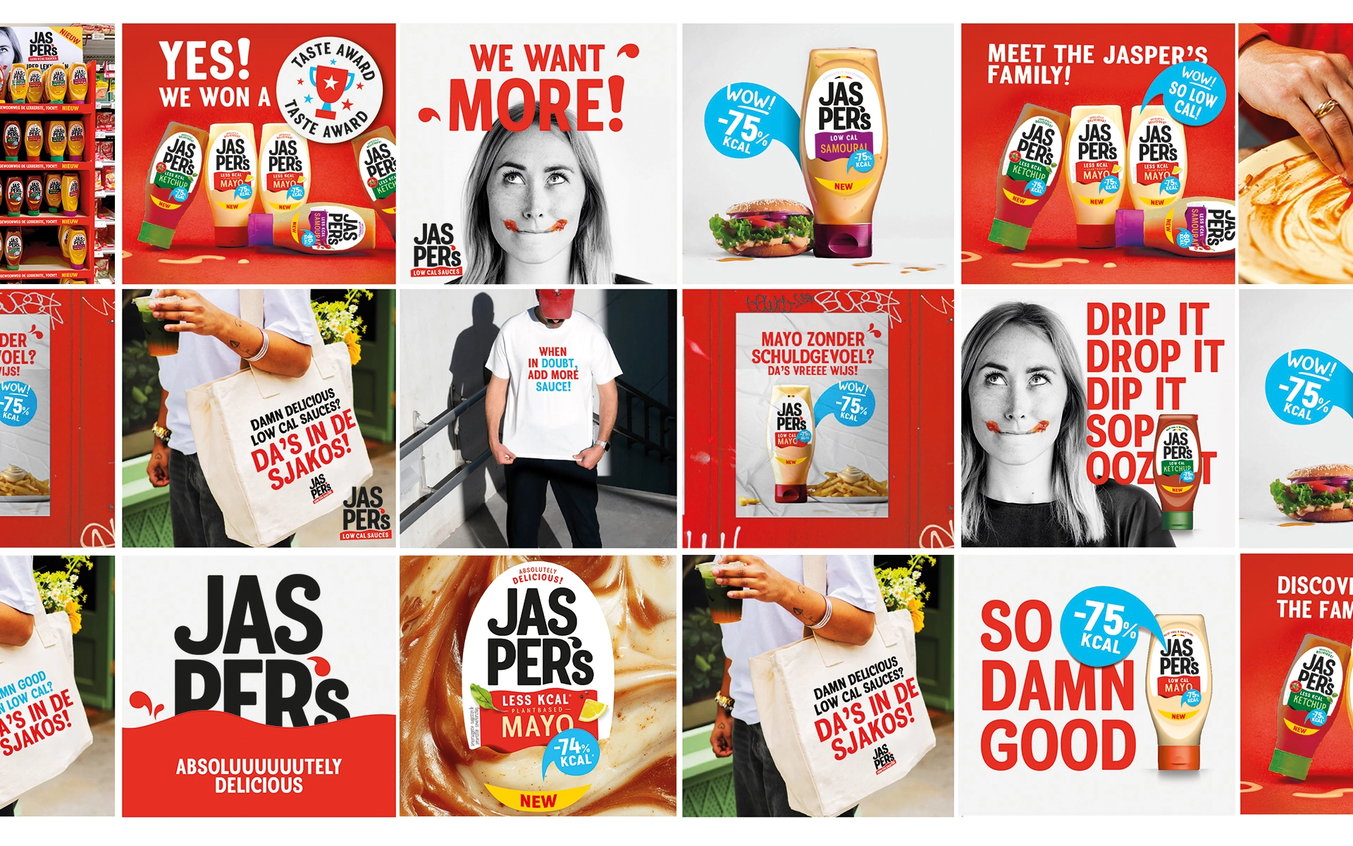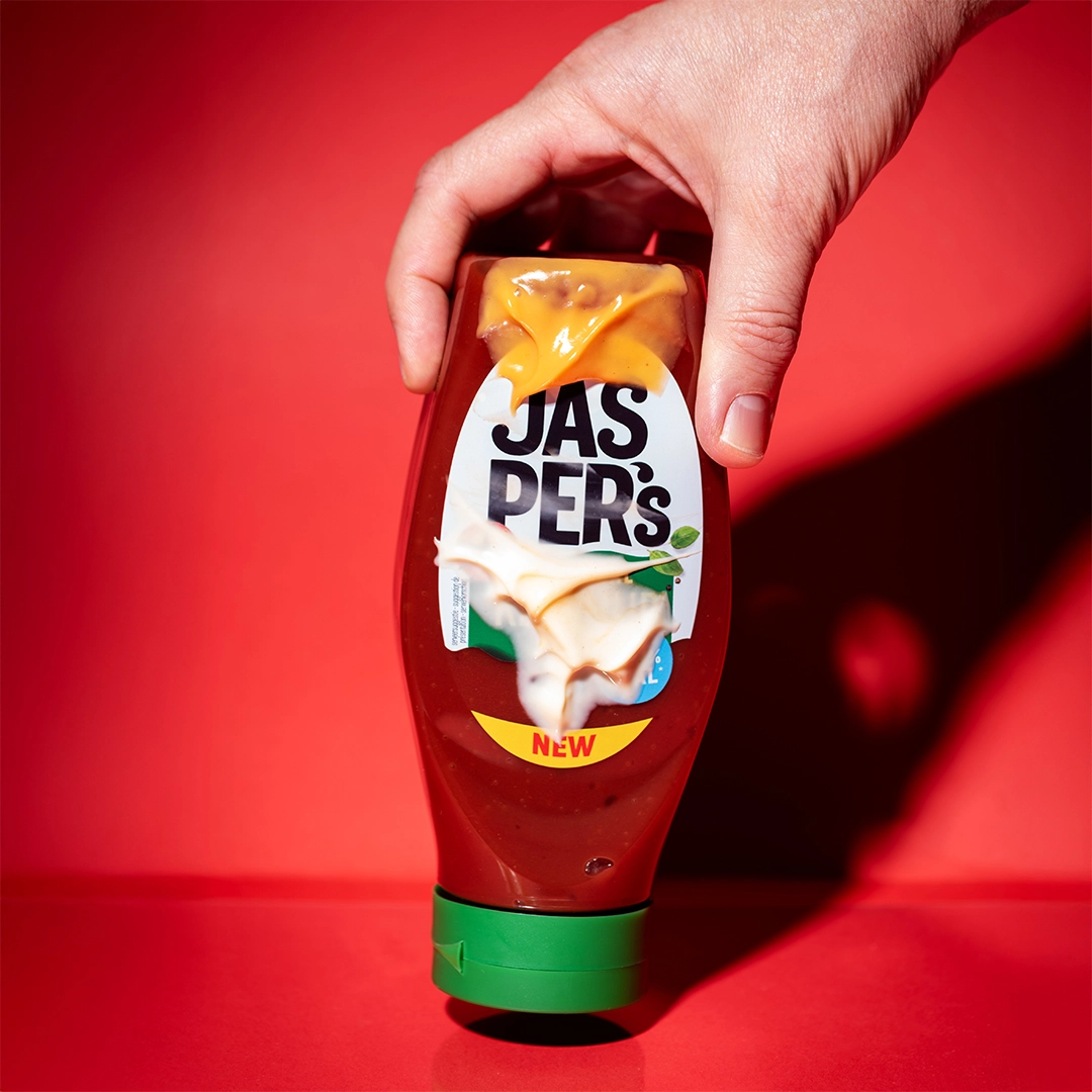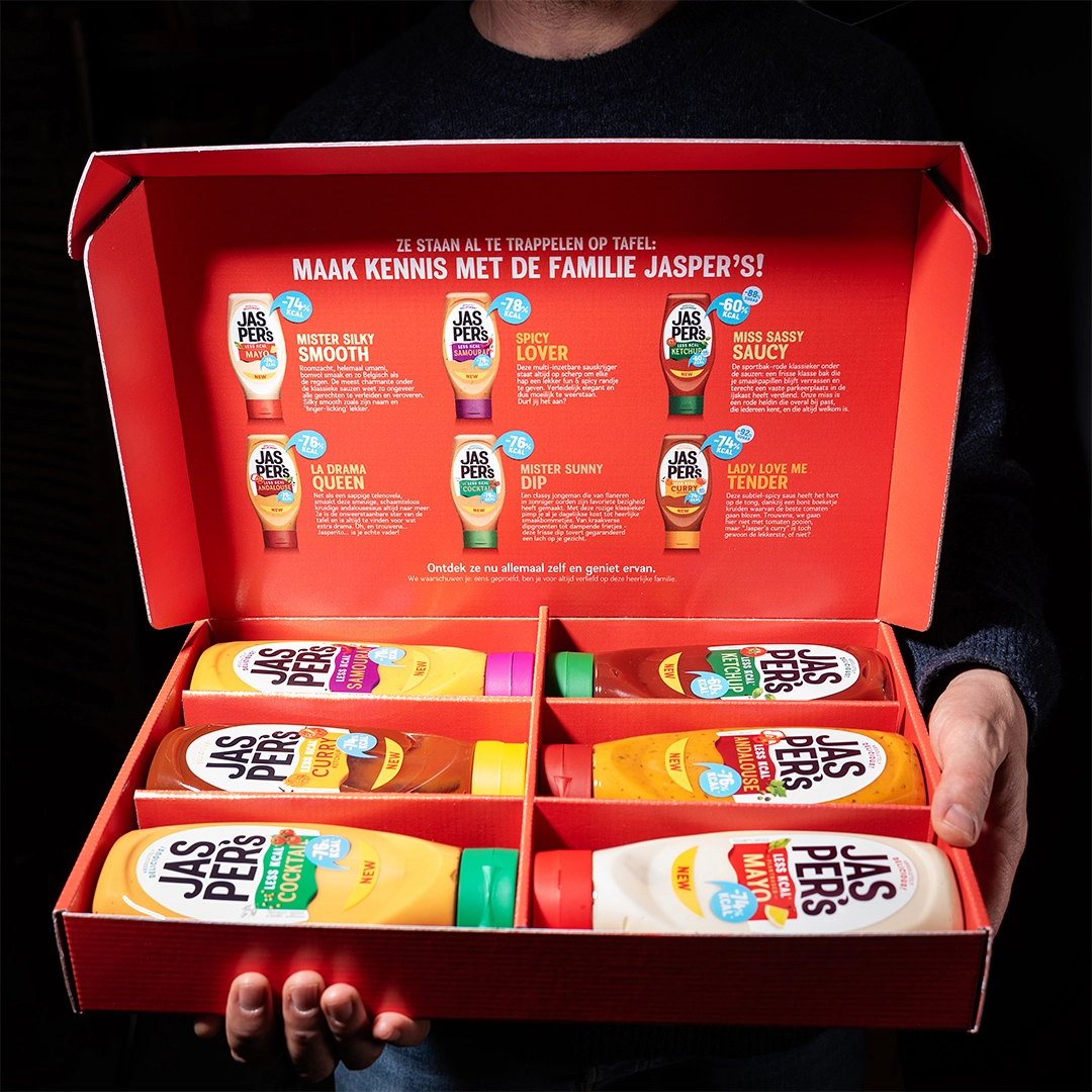 Jasper's six cold sauces with their recognisable flavours were transformed into an attractive family consisting of six flavourful designs with cheerful colours, a clear message and one important promise: fewer calories can actually be very tasty!